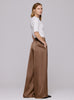 "Celia Trousers Brown" fra Julie Josephine. En eksklusiv bukse designet for å bevege seg vakker med deg. Celia Trousers Brown fra Julie Josephine er elegant, flytende og flatterende. Buksen er laget av en skinnende sateng med en subtil glans, og faller uanstrengt fra en ren høy linning til et vidt, flagrende ben. Et allsidig plagg for dag og natt som balanserer mykhet og struktur.