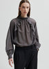 "Kannika Blouse Beluga" fra Second Female. Superfin bluse med rusjedetaljer fra Second Female. Blusen fra Second Female er laget av et lett, halvgjennomsiktig stoff. Har ståkrage og knappelukking bak i nakken. Diagonale rysjer over brystet. Raglanermer med knappelukking. Løs, flytende silhuett.